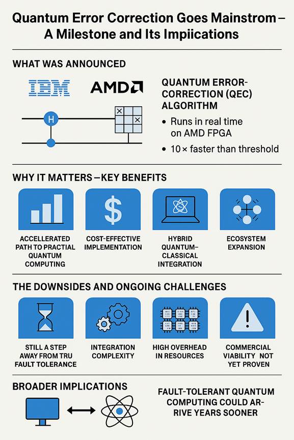 In summary, IBM’s announcement that a quantum error-correction algorithm runs in real-time on a commercially accessible AMD FPGA chip represents a significant leap forward in making quantum computing more practical. The benefits are clear: improved scalability, lower hardware barriers, and accelerated timelines. The downsides and caveats remain: we are not yet at fully fault-tolerant quantum computers, integration and engineering challenges persist, and commercial readiness is still unfolding.